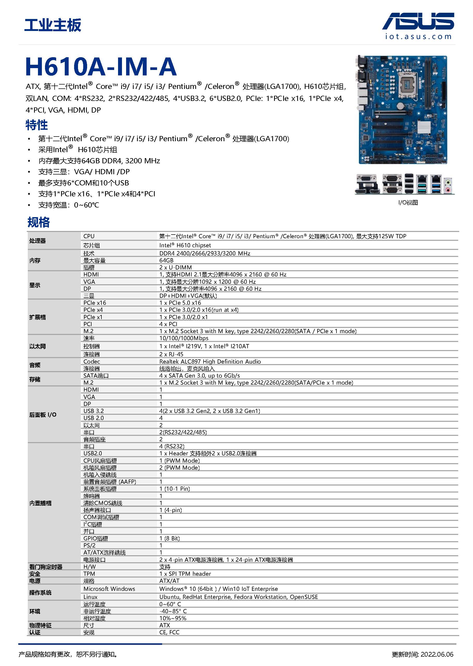 ATX, 第十二代Intel® Core™ i9/ i7/ i5/ i3/ Pentium® /Celeron® 处理器(LGA1700), H610芯片组,双LAN, COM: 4*RS232, 2*RS232/422/485, 4*USB3.2, 6*USB2.0, PCIe: 1*PCIe x16, 1*PCIe x4, 4*PCI, VGA, HDMI, DP