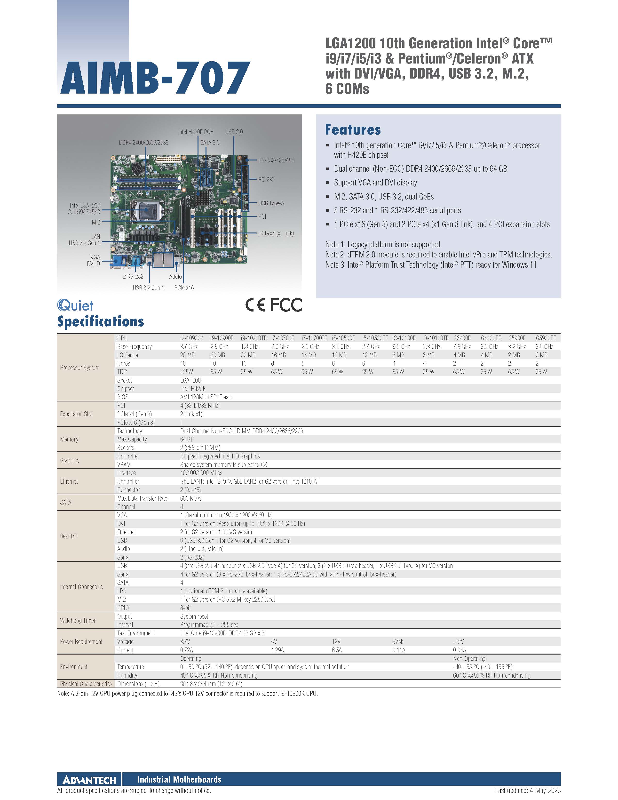 LGA1200 第10代 Intel® Core™ i9/i7/i5/i3 & Pentium®/Celeron® ATX主板,带DVI/VGA, DDR4, USB 3.2, M.2, 6 COMs