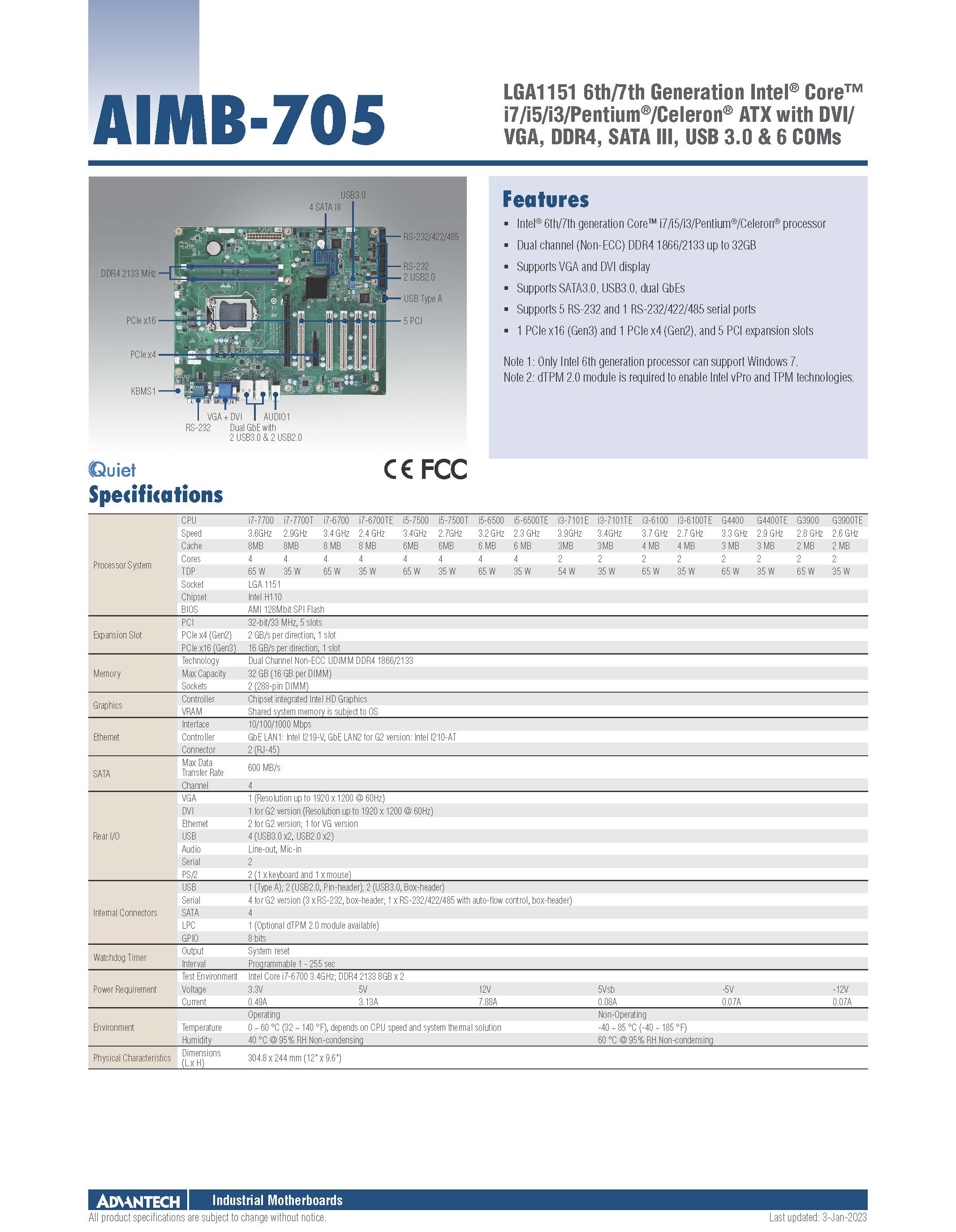 LGA1151 第6/7代Intel® Core™ i7/i5/i3/Pentium®/Celeron® ATX主板,带DVI/VGA, DDR4, SATA III, USB 3.0 & 6 COMs