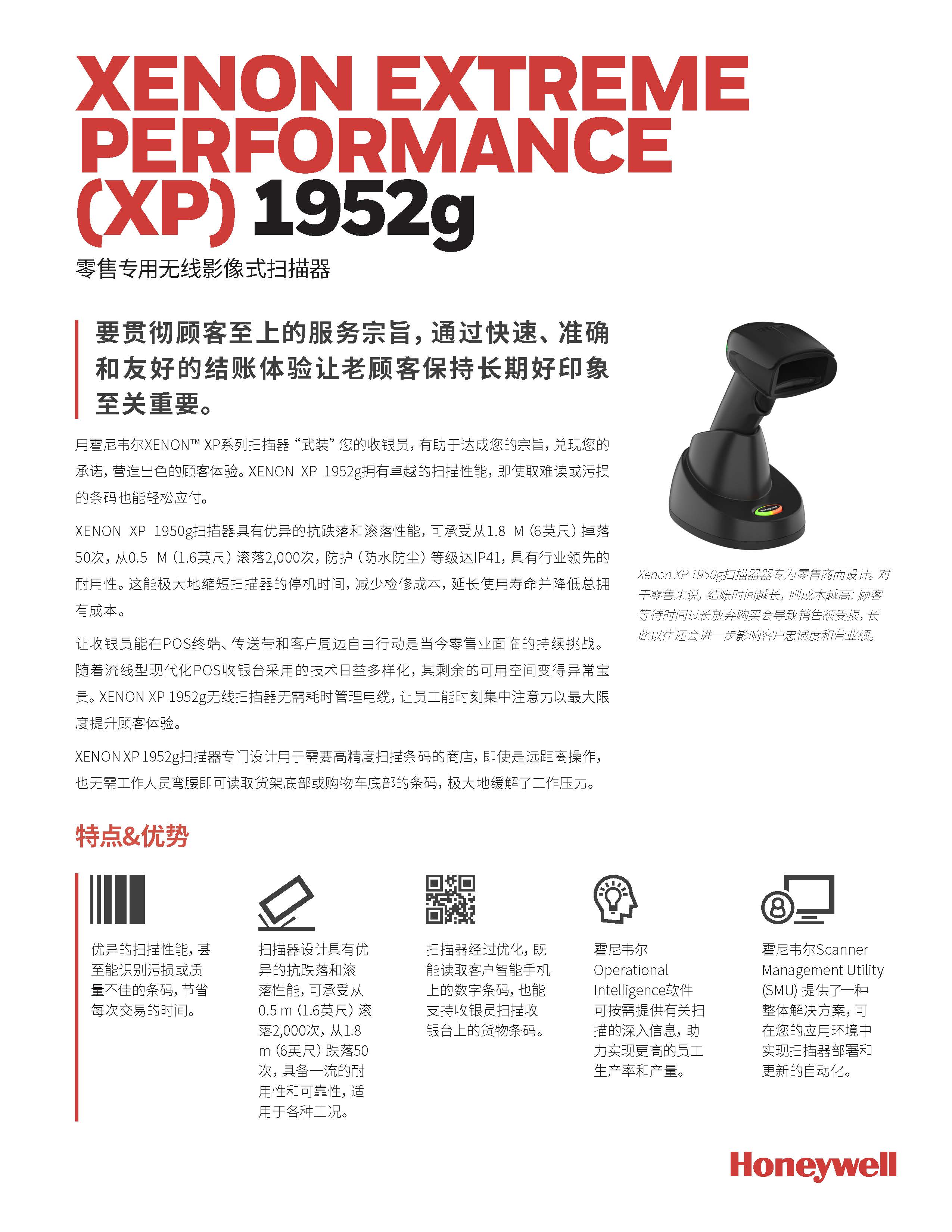 Xenon XP 1952g是一款具备卓越性能和耐用性的无线二维条码扫描器。它提供行业领先的耐用性,可改善员工生产率,延长正常运行时间,并降低总体拥有成本(TCO)。