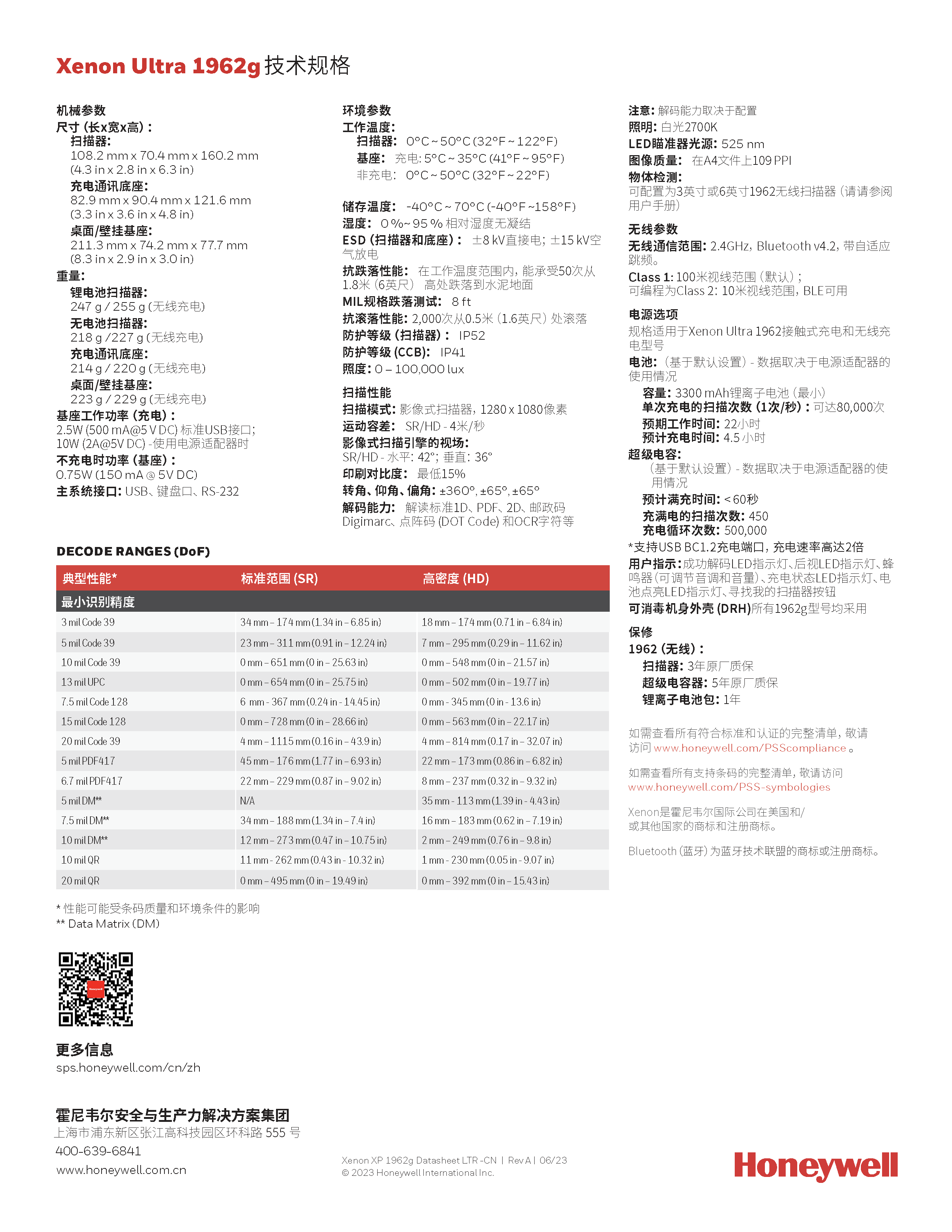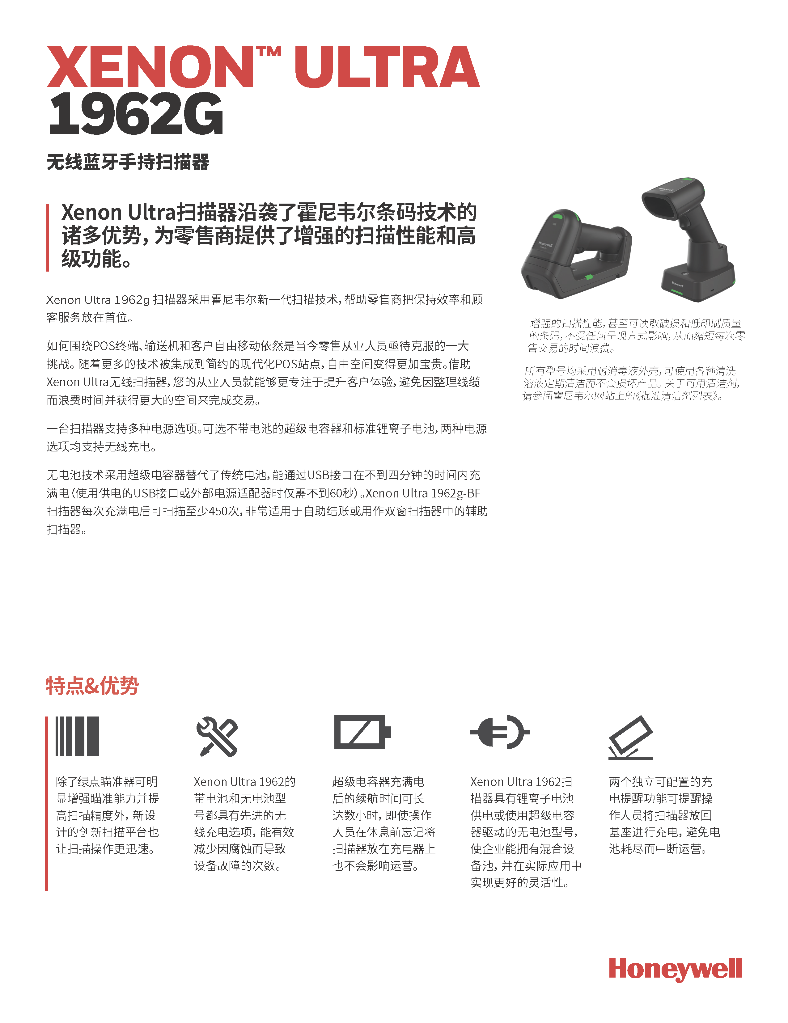 Xenon Ultra 1962g 扫描器采用霍尼韦尔新一代扫描技术,帮助零售商把保持效率和顾客服务放在首位。如何围绕POS收银结算、输送机和客户自由移动依然是当今零售从业人员亟待克服的一大挑战。 随着更多的技术被集成到简约的现代化收银台,自由空间变得更加宝贵。借助Xenon Ultra无线扫描器,您的从业人员就能够更专注于提升客户体验,避免因整理线缆而浪费时间并获得更大的空间来完成交易一台扫描器支持多种电源选项。可选不带电池的超级电容器和标准锂离子电池,两种电源选项均支持无线充电。无电池技术采用超级电容器替代了传统电池,能通过USB接口在不到四分钟的时间内充满电(使用供电的USB接口或外部电源适配器时仅需不到60秒)。Xenon Ultra 1962g-BF扫描器每次充满电后可扫描至少450次,非常适用于自助结账或用作双窗扫描器中的辅助扫描器。增强的扫描性能,甚至可读取破损和低印刷质量的条码,不受任何呈现方式影响,从而缩短每次零售交易的时间浪费。所有型号均采用耐消毒液外壳,可使用各种清洗溶液定期清洁而不会损坏产品。 关于可用清洁剂,请参阅霍尼韦尔网站上的《批准清洁剂列表》。