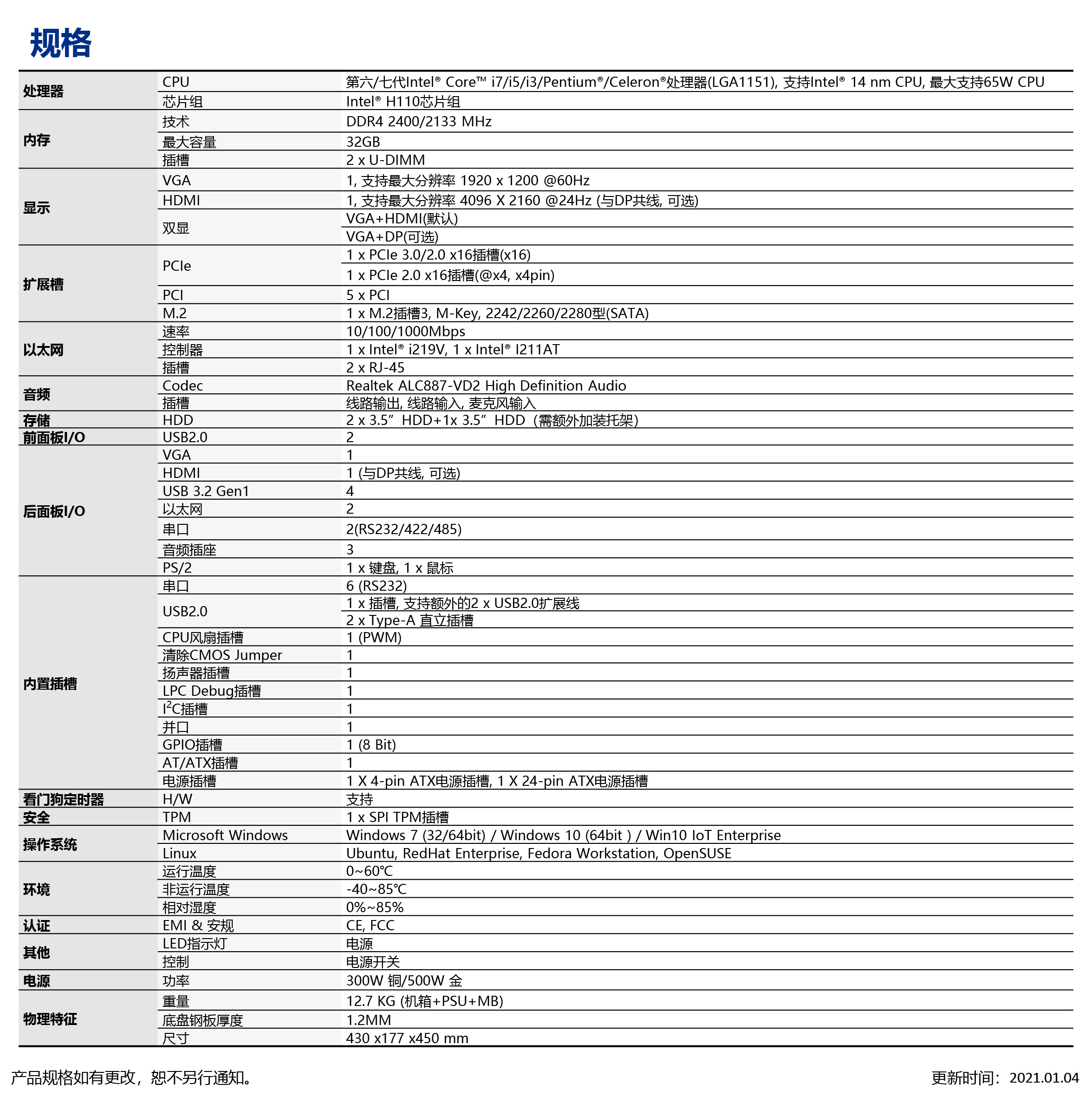 4U标准上架式工业计算机, H110芯片组, 第六/七代Intel® Core™ i7/i5/i3/Pentium®/Celeron®处理器 (LGA1151), 双 LAN, 串口: 2*RS232/422/485; 6*RS232, 4*USB3.2, 6*USB2.0, PCIe:1*PCIe 3.0/2.0 x16插槽(x16); 1*PCIe 2.0 x16插槽(@x4, x4pin), 5*PCI