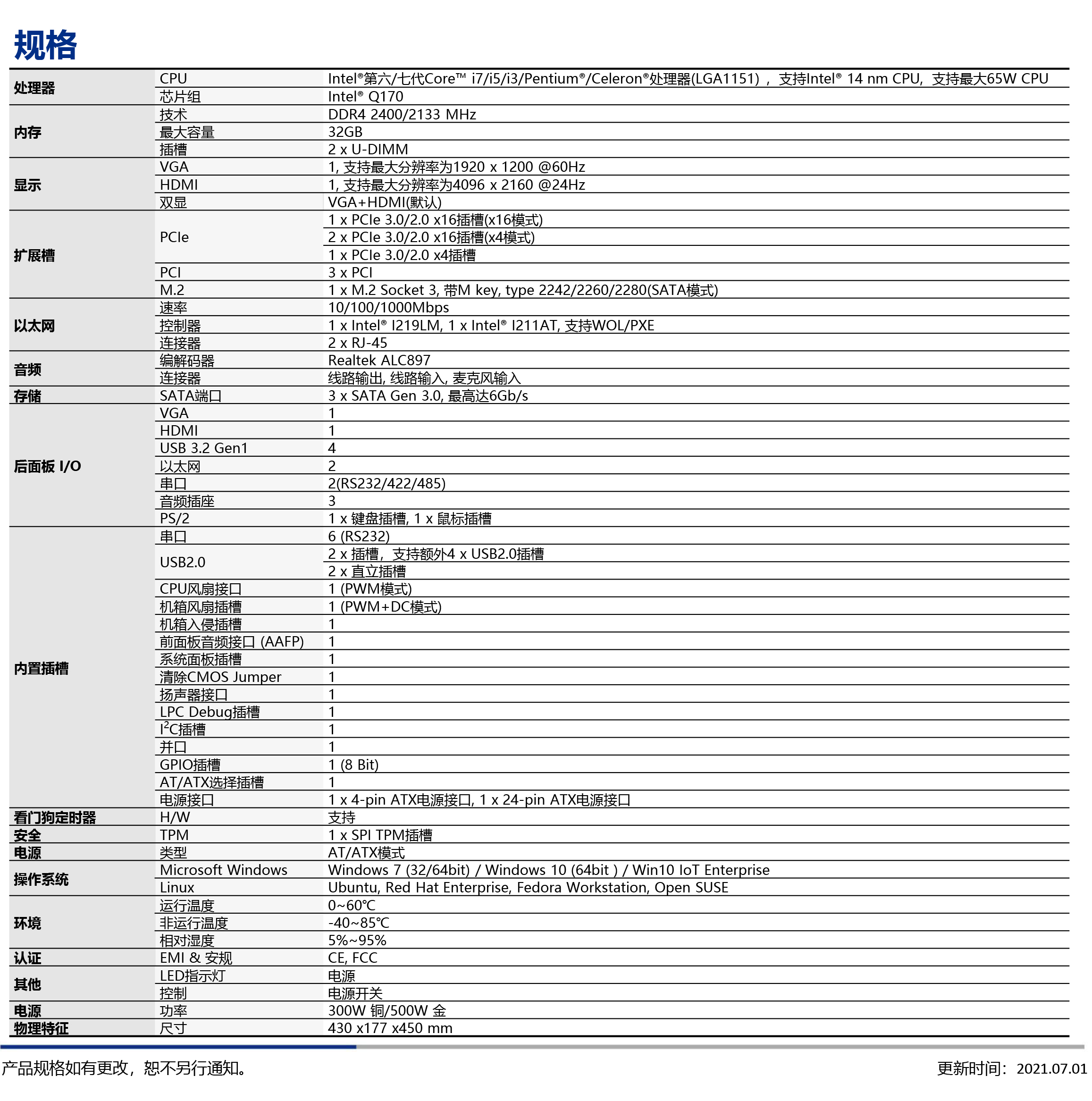 4U 标 准 上 架 式 工 业 计 算 机 , Q170 芯片组, 第六 / 七代Intel® Core™ i7/i5/i3/Pentium®/Celeron® 处理器(LGA1151), 双 LAN, 串口: 2*RS232/422/485; 6*RS232, 4*USB3.2, 6*USB2.0, PCIe:1*PCIe 3.0/2.0 x16插槽(x16模式), 2*PCIe 3.0/2.0 x16插槽(x4模式), 1*PCIe 3.0/2.0 x4插槽, 3*PCI