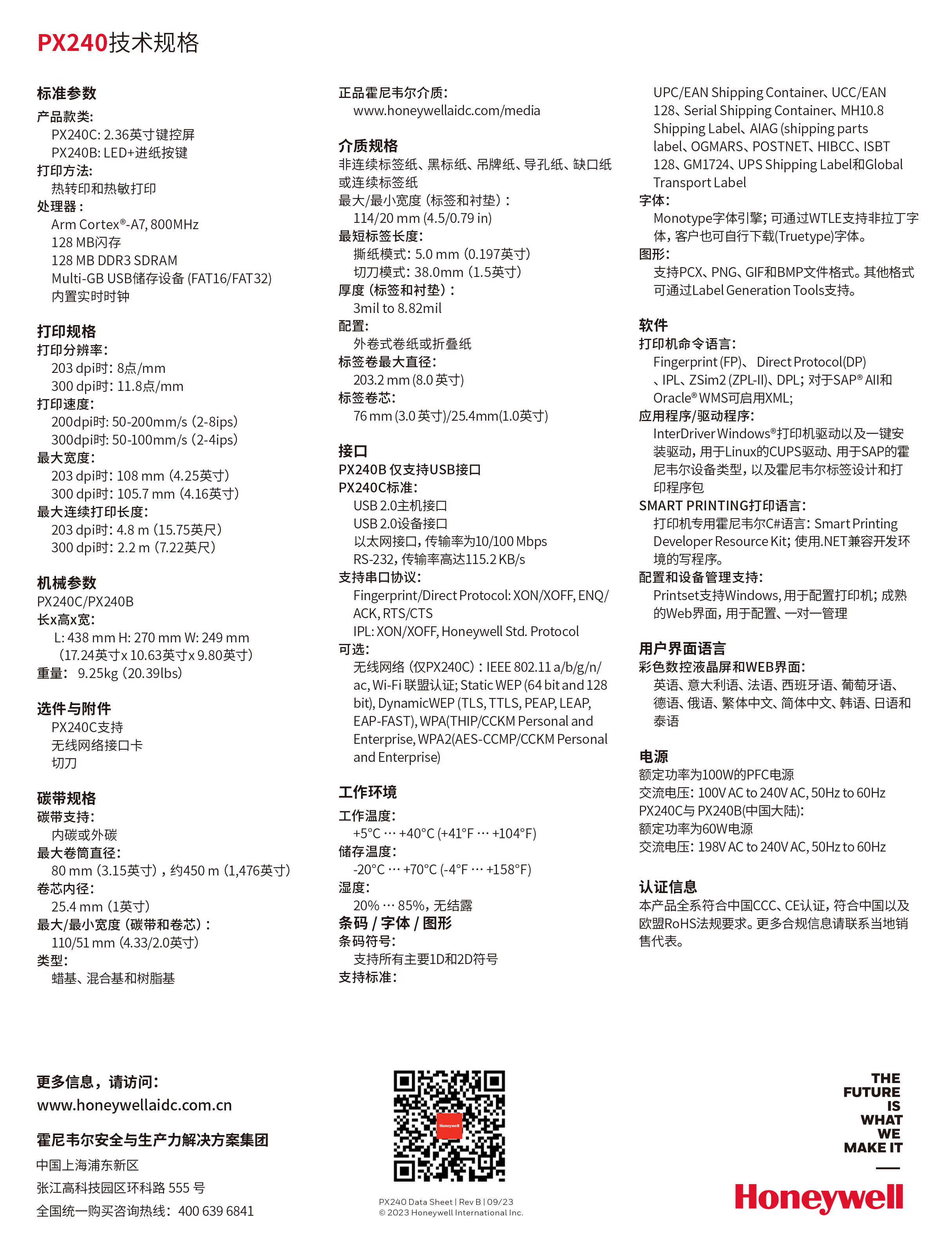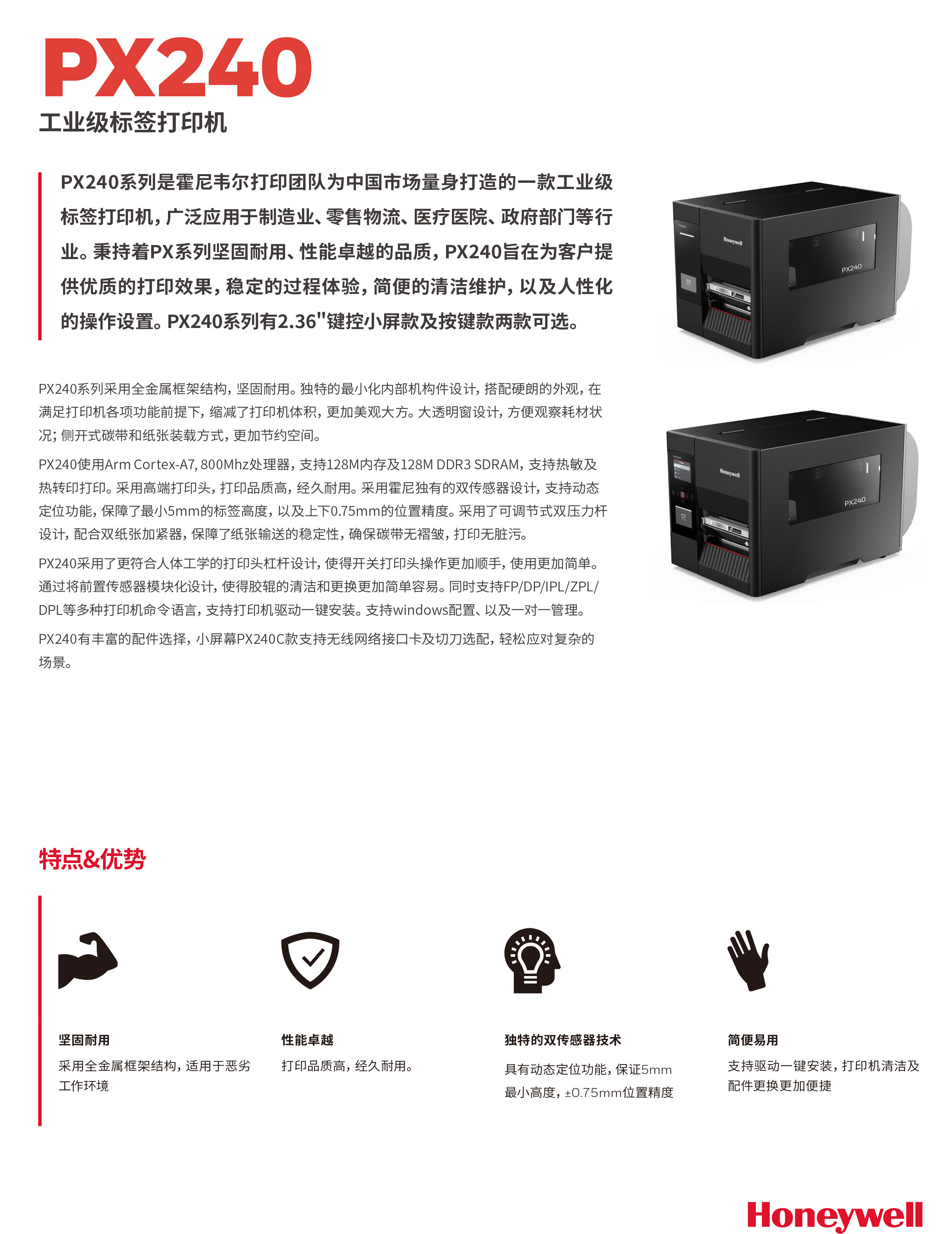 PX240PX240使用Arm Cortex-A7, 800Mhz处理器,支持128M内存及128M DDR3 SDRAM,支持热敏及热转印打印。采用高端打印头,打印品质高,经久耐用。采用霍尼独有的双传感器设计,支持动态定位功能,保障了最小5mm的标签高度,以及上下0.75mm的位置精度。采用了可调节式双压力杆设计,配合双纸张加紧器,保障了纸张输送的稳定性,确保碳带无褶皱,打印无脏污。